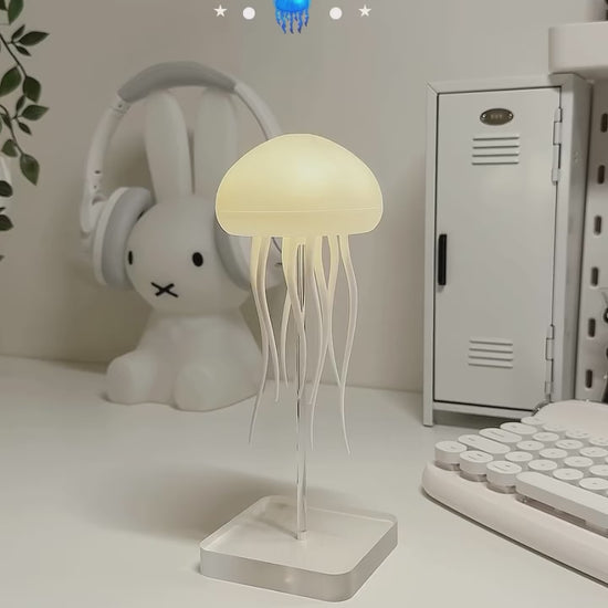 1. Enhance Your Space: Unique jellyfish light changes the atmosphere by adjusting the light, with tentacles that can be adjusted, giving a refreshing feeling as the light changes with the rhythm of the jellyfish 2. Relaxation of the Body and Mind: Immerse yourself in a peaceful underwater world with the Jellyfish Light Lamp. It's mesmerizing to see jellyfish tentacles sway rhythmically, creating an ideal sleeping environment for children while relieving stress. Perfect for use as a versatile desk lamp, night light, or mood light with a colorful bubble display 3. Soften Light: Features a silent motor and 12 multicolored LED bulbs, lasts up to 3 hours of continuous use, charges in just 1.5 hours, soft light that is not harmful to the eyes, comes in 17 RGB colors, and has a built-in 1000mAh battery 4. Mesmerizing Visuals: Activated with a short press, the dynamic touch of the jellyfish light adjusts the light mode and changes to full color mode, creating a mesmerizing and dazzling visual experience with changing light effects, while the light supports memory playback 5. Perfect Surprise: Emulate a serene sea atmosphere with the vivid jellyfish model floating silently, producing a delightful aquarium effect, suitable for any home or business space. The ideal present for all occasions, bringing a peaceful and quiet mood to any environment Transform your space with this unique jellyfish light lamp. Its intelligent lighting design creates an ideal sleeping environment for children. Give it a short press to activate and enjoy its calming effect. Perfect for enhancing home or office environments.